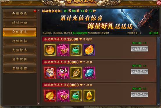 【活动内容】活动期间,累计充值达到指定金额即可领取1次对应奖励!