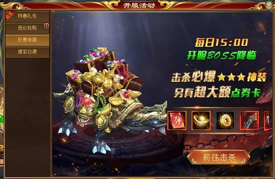 财宝巨兽必定掉落当前等级红品3星装备,并将掉落大量点券、元宝卡、金币