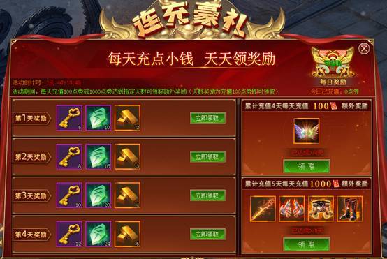 累计5天,每天充值满1000点券可额外领取武将甘宁全套觉醒装备