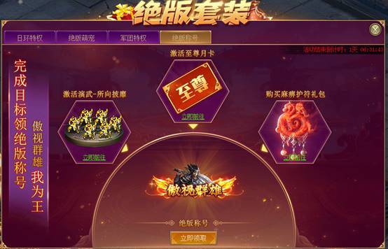 绝版称号:激活演武-所向披靡+激活至尊月卡+购买麻痹礼包=激活绝版称号傲视群雄